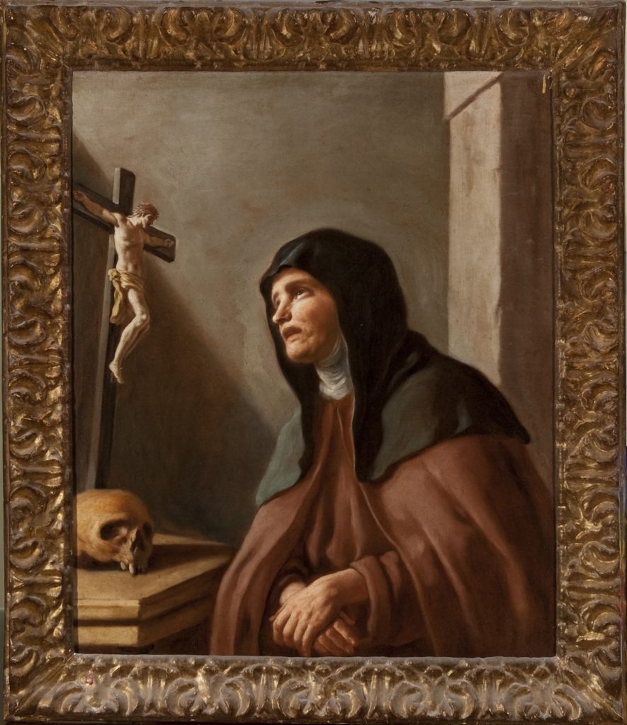 Prodotto devoto e da camera, l’effigie mostra modi schiariti nella tavolozza e inteneriti negli impasti, con trapassi morbidi, ed è certamente un’opera assai tarda del pittore, che con ogni probabilità la realizzò per proprio sentimento. Tra le opere di De Mura pubblicate negli ultimi anni, un confronto per tipologia può essere istituito, ad esempio, con la Santa Teresa d’Avila a San Giuseppe dei Nudi a Napoli (quadro di dimensioni pressoché uguali: cfr. R. Lattuada in Il Real Monte e Arciconfraternita di San Giuseppe 2017). Ma è sul riconoscimento storico del nostro personaggio, dinanzi al teschio e al crocifisso (fine brano, quest’ultimo), che andrà ad appuntarsi soprattutto l’attenzione. La più che probabile, se non certa, individuazione della figura si deve a un’acuta, recente segnalazione di Vincenzo Rizzo (2018), il quale ha riconosciuto in essa l’immagine della suora francescana Maria Giovannella, non senza tuttavia eccedere, forse, nell’esaltazione della qualità e dell’afflato dell’opera. Questo riconoscimento si è reso possibile grazie allo studio degli inventari dei quadri di De Mura custoditi nell’archivio storico del Pio Monte: studio che può essere qui circostanziato come segue.