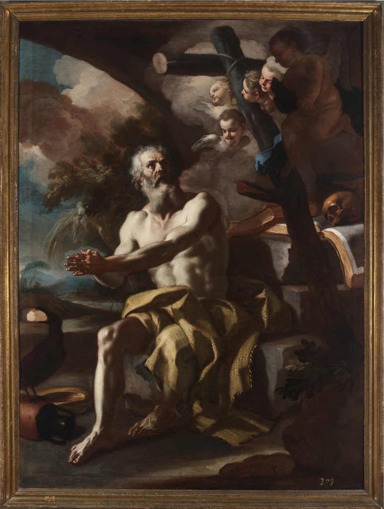 Il quadro spetta alla fase matura di De Mura. Raffaello Causa (1970) lo affiancava giustamente alla Maddalena penitente (cat. III.1.107), con una cronologia sul 1750, e al San Giovanni Battista (cat. III.1.124), giudicato tuttavia di poco successivo per ragioni stilistiche. Ora, se il Battista deve verosimilmente distanziarsi nel tempo e portarsi sin negli anni Sessanta, in ragione dello scarto formale da esso evidenziato in senso accademico-purista, l’attinenza tra il quadro in esame e la Maddalena – un’attinenza a vari livelli, per una più che probabile contemporaneità d’esecuzione – è un punto fermo d’ogni ragionamento su queste due opere. Ciò detto, resta il fatto, o comunque la sensazione, che si tratti di quadri difficili, in quanto privi di contesto, ovvero di dati o riferimenti esterni, giacché il maestro se li tenne in casa propria sino alla fine (cosa, quest’ultima, pure meritevole d’interrogativi, e al contempo casuale, specialmente in rapporto a quel che è rimasto di lui nel patrimonio attuale dell’Ente). La trama chiaroscurale forte e la gamma cromatica contenuta, in un analogo assetto compositivo, sono conformi tra le due rappresentazioni, così come il livello, vigile, della stesura pittorica. Quanto ai valori atmosferici e descrittivi, poi, le figure, immerse nel loro solitario ritiro, condividono nelle rispettive immagini un’ambientazione assai simile, cavernosa e vespertina, con uno sfondo di paesaggio pure omogeneo. In una schedatura novecentesca, del San Paolo eremita si annota, significativamente, così: “opera incompiuta, e macchiata con larghezza, e con contrasti chiaroscurali, più intensi del consueto, pel De Mura” (catalogazione post 1933). Vi è come un revival di ‘tenebrismo’ accomodato e fuori del tempo – esperimento deliberato o richiesto, oppure prova d’eclettismo? –, un elemento potenzialmente scivoloso ai fini di una datazione. Questa difficoltà è rispecchiata dalle diverse ipotesi di cronologia prospettate per la coppia. A detta di Nicola Spinosa le tele dovrebbero datarsi intorno al 1760, e l’artista, provandosi in un’alternativa credibile al nuovo classicismo soffiante in specie da Roma, si sarebbe stavolta appellato al Seicento locale e alle sue risorse mai sopite. “Ma il rinterzare le ombre, l’accrescere la severità delle forme, l’accentuare la solennità del comporre non evitano esiti da ‘accademia’ del naturalismo di riporto, per vie di intermediazione cerebrali e muovendo da esempi precedenti, mai per presa diretta del reale e del vero, sentimentale o oggettuale che fosse” (Spinosa 1986). Più lineare sembra la proposta di Vincenzo Pugliese (in Foggia capitale 1998), per il quale i dipinti andrebbero invece retrodatati sino agli anni Trenta e in linea di massima entro il 1740, e messi a confronto con opere di quel periodo, ancor non avulse da certe intonazioni marcate e impetuose a loro modo d’estrazione tardosolimenesca (per argomenti ulteriori e complementari si veda il corrispondente passaggio esposto in merito a questo dibattito per la Maddalena penitente, cat. III.1.107). Vincenzo Rizzo (2018), invece, propende per una datazione assai più tarda, agli anni 1765-1775. Il nostro San Paolo eremita, cioè Paolo di Tebe d’Egitto, vissuto tra III e IV secolo, costretto a fuggire dalle persecuzioni anti-cristiane dei Romani e ritenuto per tradizione il primo eremita, si caratterizza nel tipo barbuto e ascetico, e nella struttura anatomica ancor vigorosa e nelle masse livide, nonché in alcuni particolari propri dell’iconografia del personaggio, ispirata alla fonte agiografica della Vita Sancti Pauli primi eremitae, composta da Girolamo nella seconda metà del IV secolo. Tra i dettagli peculiari c’è, per esempio, presso questa grotta nella Tebaide, l’albero di palma, delle cui foglie e dei cui frutti Paolo si vestì e si nutrì, oppure il corvo con mezzo pane nel becco, il cibo giornaliero per lo stesso Paolo in età avanzata. Eppure gli elementi dell’iconografia e la lettura dell’effigie non dovettero risultare del tutto perspicui nella redazione dell’inventario Simonetti (1851), se vi è scritto che la tela “rappresenta un San Girolamo, sebbene i simboli espressi nel quadro si appartano dalle convenzioni usate dall’arte per indicarlo”. Dal punto di vista iconografico e tipologico (eppure non meno inerente alle qualità dello stile), un raffronto opportuno e poco scontato si deve a Giuseppe Porzio (in “Una terra felice” 2012), il quale ha attribuito a De Mura, e inteso nell’esatto soggetto, un quadro proveniente dal mercato antiquario e raffigurante un diverso momento dell’agiografia di Paolo di Tebe, cioè l’imminente incontro nel deserto tra lui e sant’Antonio abate, altro campione della vita anacoretica (passato presso la Galleria Porcini, già Napolinobilissima, il dipinto, come segnalatomi dallo stesso Porzio, che ringrazio, è migrato nel 2018 al Birmingham Museum of Art in Alabama). In questa tela, di cui si è messo in risalto l’eccezionale scenario paesistico, alquanto inusitato per De Mura, l’eremita Paolo a figura terzina è – secondo lo studioso – un precedente, ancor condizionato dall’esempio di Solimena, del grande protagonista nel dipinto al Pio Monte qui in esame, reinterpretato da De Mura in un linguaggio proprio e svolto finanche in chiave d’imponenza monumentale. Questo risultato – lo si è ricordato sopra, e in ciò la critica appare concorde – altresì non è estraneo, complici gli spunti d’ambiente, le ombre ancor ficcanti e la fisionomia senile e tesa del santo, a certo retaggio di naturalismo seicentesco, cui possiamo aggiungere riferimenti a loro modo difficilmente eludibili quali Mattia Preti e Luca Giordano. [Augusto Russo]